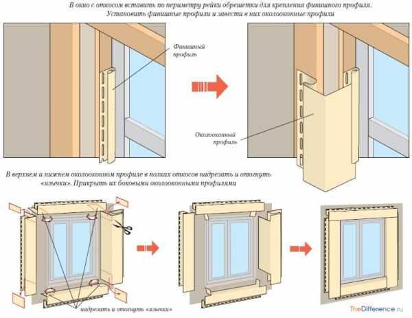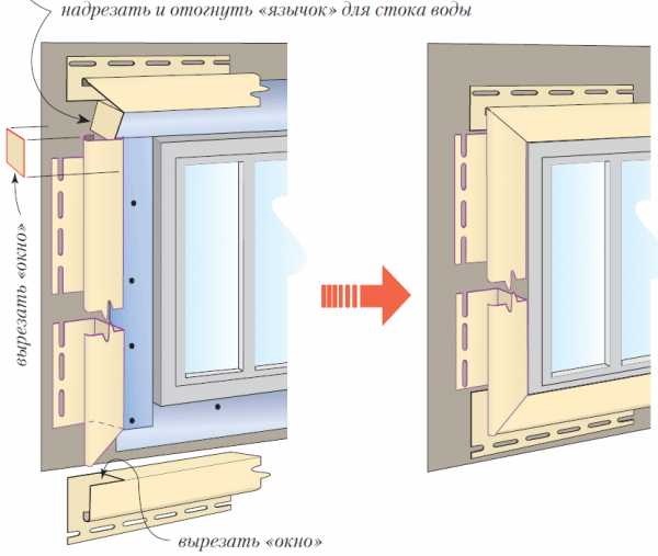 Если фасад и обрамляемый проем находятся в одной плоскости, то надрезанные кусочки винила отгибают внутрь нижнего профиля или просто удаляют.