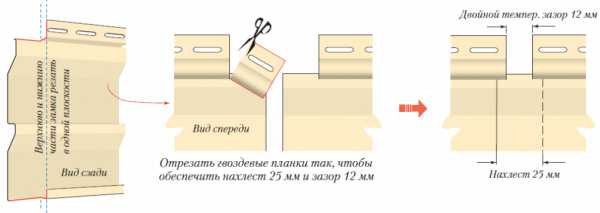 Монтируя панели сайдинга своими руками внахлест, подрежьте крепежные рамки и замки панелей, чтобы длина нахлеста составляла 25 мм (как и в случае с профилями) (Рис. 14).