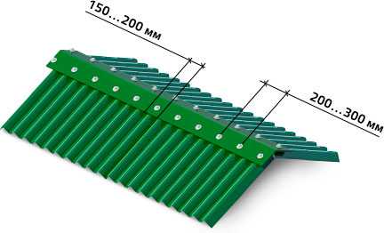 Устанавливать конек нужно на верхнее ребро крыши, при помощи оцинкованных саморезов. Их следует закрепить непосредственно в волну сверху. При этом учитывайте шаг крепления саморезов, который составляет 20–30 см.