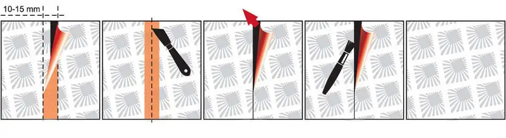 Чтобы облегчить задачу, уже на этапе подготовки стен нужно обеспечить их идеальную ровность. Первое полотно нужно завести на угол с добором в 2 см, второе сверху наносят впритык к углу. Последующий кусок наносится внахлёст. Дав высохнуть, нахлест нужно срезать острым лезвием в угол. Клей рекомендуется наносить обильно, чтобы обеспечивалось скольжение. Это позволит без особых усилий выровнять и совместить куски.