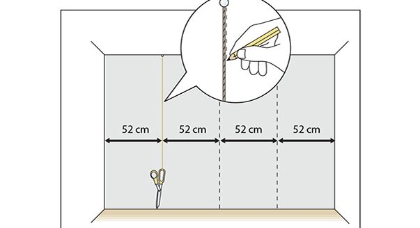 Заранее советуем выбрать широкие рулоны, поскольку с ними легче и быстрее работать, чем с тонкими. Чтобы между ними не было некрасивых зазоров, и полотно смотрелось как единое целое, их необходимо располагать встык.При помощи лазерного нивелира проведите по комнате вертикальные линию, которая будет располагаться в одном метре от угла.