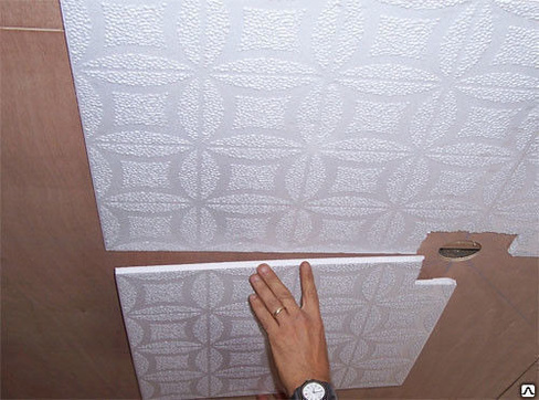 Если же неровности, выбоины или сколы незначительны – их с успехом скроет сама плитка. Кстати, основанием для устройства такого клееного потолка может служить не только оштукатуренная поверхность, но и бетон, дерево, пластик.