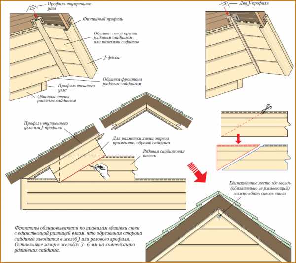 Обшивание фронтонов можно выполнять в любом из направлений. Если фронтон имеет отличие от стены, то их обшивка разграничивается между собой горизонтальным Н-молдингом. Если фронтон имеет выступ внутрь, то отделка стены должна закончиться финишем, а отделка фронтона начаться аквилоном и стартовой панелью.