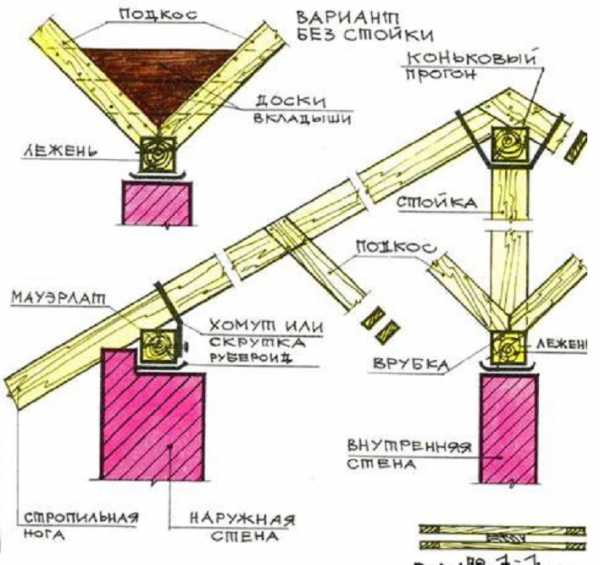 - Крепление наслонных (нижних) стропил к боковым прогонам осуществляется гвоздями, а к мауэрлату металлическими пластинами или скобами.