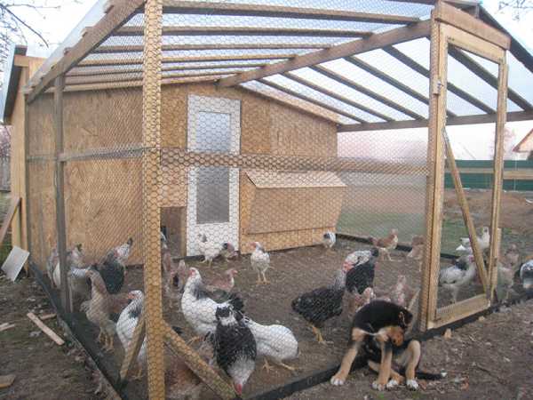 Наличие правильного выгула — тоже обязательное условие строительства птичника. Птицы должны иметь возможность копаться в земле и получать солнечную инсоляцию. Вольер обычно примыкает к птичьему домику и огораживается сеткой, как на фото. По сравнению с курятником, он должен иметь несколько большие размеры. Правильно будет на одну несушку предусмотреть не менее одного метра квадратного площади. При устройстве вольера, правильно будет сделать над ним защитный козырёк от дождя и солнечных лучей.