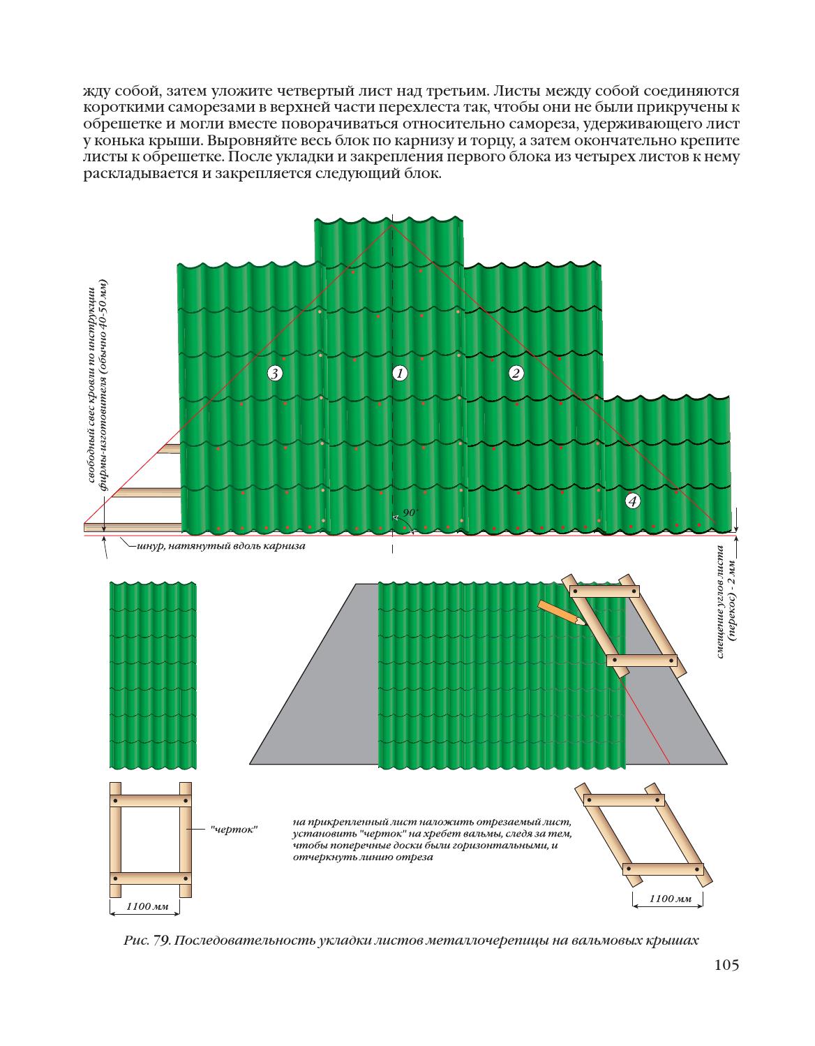 Положив таким образом блок из четырех листов, его выравнивают и закрепляют на кровле. По этой же схеме укладывают все остальные листы.