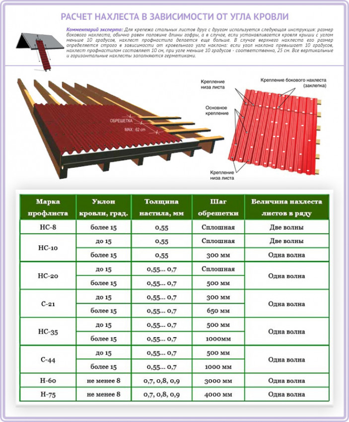 Величина нахлеста профиля для крепления профнастила на крышах с разным уклоном: