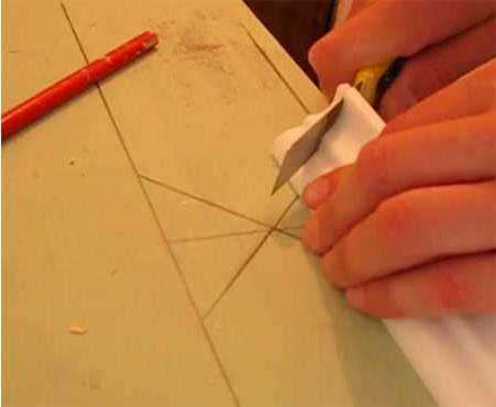 Угол в 60º так же очень легко сделать. Из школьного курса известно, что углы в равностороннем треугольнике равны 60º, начертите на бумаге треугольник с одинаковыми сторонами, вырежьте, это и будет шаблон, по которому делаются прорезы.