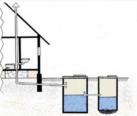 Схема септика из бетонных колец из двух камерОднокамерные модели лишь собирают стоки и частично осаждают нерастворимые включения. Такие модификации дешевы, но малоэффективны и подходят только для периодически посещаемых дач. Удаление загрязненной воды из однокамерного септика может производиться только при помощи ассенизаторской машины. Аналогичное очищение требуется и двухкамерным, и трехкамерным конструкциям, однако требуемая частота откачивания в этих случаях значительно меньше.