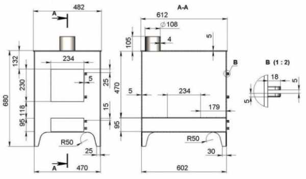 Схема-чертёж с указанием размеров такой печки приведён ниже.