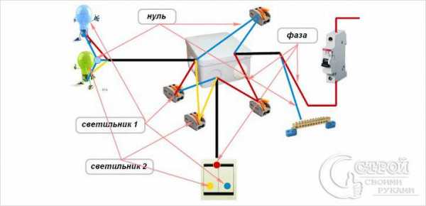 Π Π½Π°ΡΠ΅ΠΌ ΠΏΡΠΈΠΌΠ΅ΡΠ΅ Π²ΡΠΊΠ»ΡΡΠ°ΡΠ΅Π»Ρ Π΄Π²ΡΡ ΠΊΠ»Π°Π²ΠΈΡΠ½ΡΠΉ. ΠΠ°ΠΆΠ΄Π°Ρ ΠΊΠ»Π°Π²ΠΈΡΠ° ΠΎΡΠ²Π΅ΡΠ°Π΅Ρ Π·Π° ΠΊΠΎΠ½ΡΡΠΎΠ»Ρ ΠΎΡΠ΄Π΅Π»ΡΠ½ΠΎΠΉ Π³ΡΡΠΏΠΏΡ ΠΎΡΠ²Π΅ΡΠΈΡΠ΅Π»ΡΠ½ΡΡ ΠΏΡΠΈΠ±ΠΎΡΠΎΠ². ΠΡΠΎΡΠΎΠΉ ΠΏΡΠΎΠ²ΠΎΠ΄ ΠΊΠ°Π±Π΅Π»Ρ ΠΏΠ΅ΡΠ΅ΠΊΠ»ΡΡΠ°ΡΠ΅Π»Ρ ΡΠΎΠ΅Π΄ΠΈΠ½ΡΠ΅ΠΌ Ρ ΠΏΠ΅ΡΠ²ΠΎΠΉ ΠΊΠ½ΠΎΠΏΠΊΠΎΠΉ, ΡΡΠ΅ΡΠΈΠΉ ΠΏΡΠΎΠ²ΠΎΠ΄ ΠΏΠΎΠ΄ΡΠΎΠ΅Π΄ΠΈΠ½ΡΠ΅ΠΌ ΠΊΠΎ Π²ΡΠΎΡΠΎΠΉ ΠΊΠ»Π°Π²ΠΈΡΠ΅.