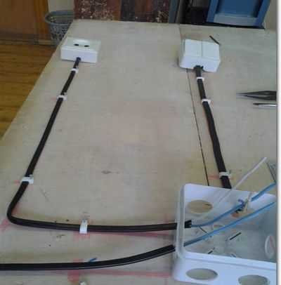 ΠΠ°Π²ΠΎΠ΄ΠΈΠΌ Π² ΠΏΡΠ΅Π΄Π²Π°ΡΠΈΡΠ΅Π»ΡΠ½ΠΎ Π²ΡΡΡΠΎΠ΅Π½Π½ΡΡ Π² ΡΡΠ΅Π½Ρ Π»ΠΈΠ±ΠΎ ΠΆΠ΅ Π·Π°ΠΊΡΠ΅ΠΏΠ»Π΅Π½Π½ΡΡ Π½Π° ΠΎΡΠ½ΠΎΠ²Π°Π½ΠΈΠΈ (Π² Π·Π°Π²ΠΈΡΠΈΠΌΠΎΡΡΠΈ ΠΎΡ ΠΌΠΎΠ΄Π΅Π»ΠΈ) ΡΠ°ΡΠΏΡΠ΅Π΄Π΅Π»ΠΈΡΠ΅Π»ΡΠ½ΡΡ ΠΊΠΎΡΠΎΠ±ΠΊΡ ΠΏΡΠΈΠΌΠ΅ΡΠ½ΠΎ 10 ΡΠΌ ΠΏΡΠΎΠ²ΠΎΠ΄Π°. Π‘Π½ΠΈΠΌΠ°Π΅ΠΌ Ρ ΠΊΠ°Π±Π΅Π»Π΅ΠΉ ΠΎΠ±ΡΡΡ ΠΎΠ±ΠΎΠ»ΠΎΡΠΊΡ. ΠΠ°ΡΠ΅ΠΌ ΡΠ΄Π°Π»ΡΠ΅ΠΌ ΠΏΡΠΈΠ±Π»ΠΈΠ·ΠΈΡΠ΅Π»ΡΠ½ΠΎ 0,5 ΡΠΌ ΠΈΠ·ΠΎΠ»ΡΡΠΈΠΈ Ρ ΠΊΠ°ΠΆΠ΄ΠΎΠΉ ΠΆΠΈΠ»Ρ. Π ΡΡΠΎΠΌ ΠΌΠΎΠΌΠ΅Π½ΡΠ΅ ΠΎΡΠΈΠ΅Π½ΡΠΈΡΡΠ΅ΠΌΡΡ ΠΏΠΎ ΡΠΈΡΡΠ°ΡΠΈΠΈ β ΡΡΠΈΡΠ°Π΅ΠΌ ΡΡΠΎΠ»ΡΠΊΠΎ ΠΈΠ·ΠΎΠ»ΡΡΠΈΠΈ, ΡΡΠΎΠ±Ρ ΠΆΠΈΠ»Ρ ΠΌΠΎΠΆΠ½ΠΎ Π±ΡΠ»ΠΎ ΡΠΎΠ΅Π΄ΠΈΠ½ΠΈΡΡ Π²ΡΠ±ΡΠ°Π½Π½ΡΠΌ ΡΠΏΠΎΡΠΎΠ±ΠΎΠΌ.