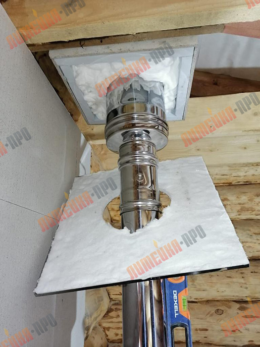 После того как устройство закреплено на потолке, поднимаются на чердак или второй этаж, и заполняют промежуток между наружной стенкой трубы и балками теплоизолятором.В качестве теплоизоляции можно использовать базальтовую вату. Но обязательно проверьте, область рабочих температур должна быть больше 600°C.