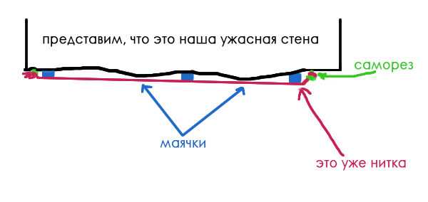Если у нас получается на стене больше двух маячков — ставим их по краям, после чего растягиваем нитку (либо просим двух товарищей, либо вкручиваем по шурупу ЗА мячками и растягиваем нитку, и ставим маячок по центру, так, чтобы когда Вы выставите его в уровень, нитка его слегка касалась, таким образом плоскость стены у нас будет выдержана практически идеально, если конечно, хорошо натяните нитку.
