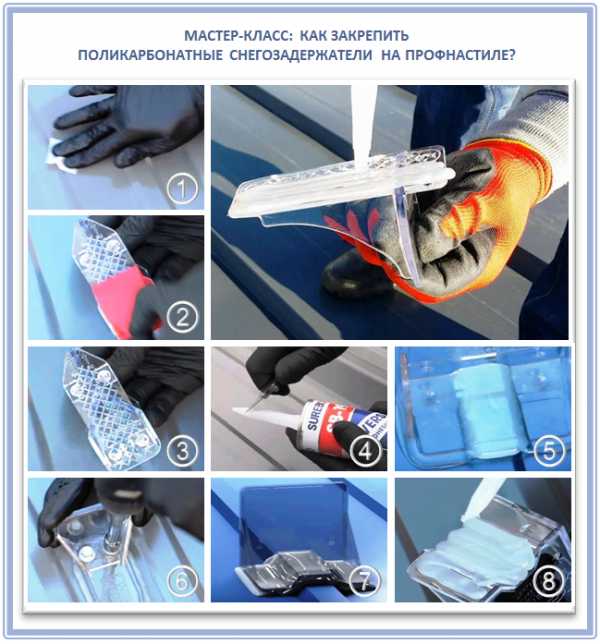 Отдельного внимания заслуживает процесс монтажа снегодержателей из поликарбоната. Разметка под них выполняется таким же образом, как описано выше. Фиксация снегодержателей из поликарбоната может производиться: