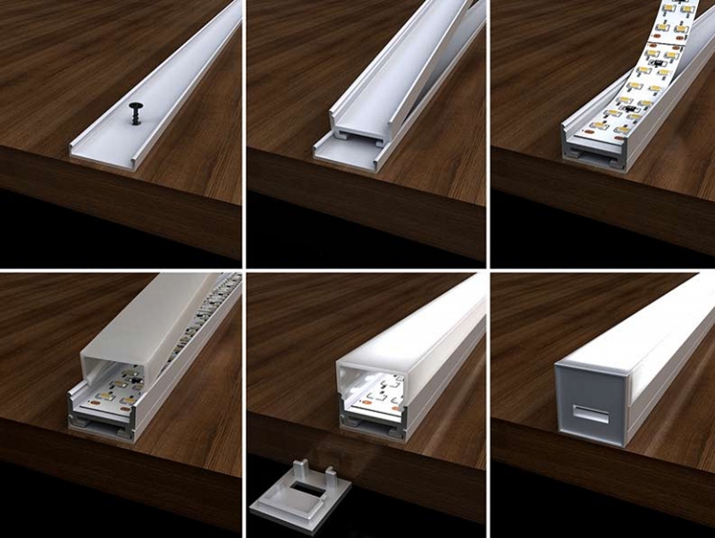 После того, как все элементы на этой конкретной секции светильника собраны и закреплены, вставьте световую ленту и разъемы в монтажный канал.