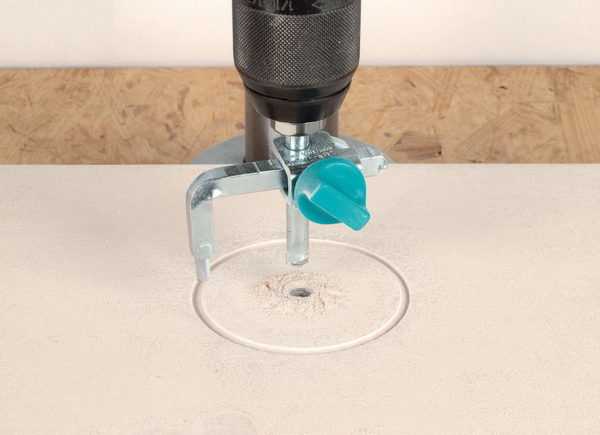 Еще один режущий инструмент, с помощью которого можно сверлить в кафеле большие отверстия. По сути, это копьевидное сверло, на стержне которого установлен кронштейн. К последнему прикреплен резак. Вращение дрели крутит резак на кронштейне, который и очерчивает окружность. Диаметр среза можно варьировать, изменяя расстояние от сверла до резака путем смещения последнего по длине кронштейна.