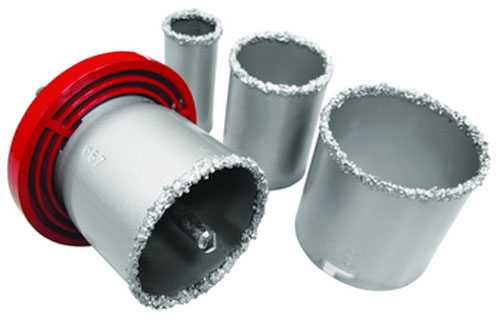 - С вольфрамовым напылением. Это более дешевые инструменты. Но по качеству обработки они не уступят алмазным моделям. При этом данный тип фрез можно использовать для высверливания отверстий в камнях: мраморе, граните и так далее. Есть у данного инструмента и своя конструктивная особенность – это сверло внутри цилиндра, который функционирует, как центровочный элемент. Оно врезается в керамику и не дает смещаться фрезе относительно центра. В алмазной категории такие инструменты тоже есть. Еще одно преимущество – нет необходимости охлаждать кромки. Вольфрам и при больших температурах легко вгрызается в твердые поверхности.