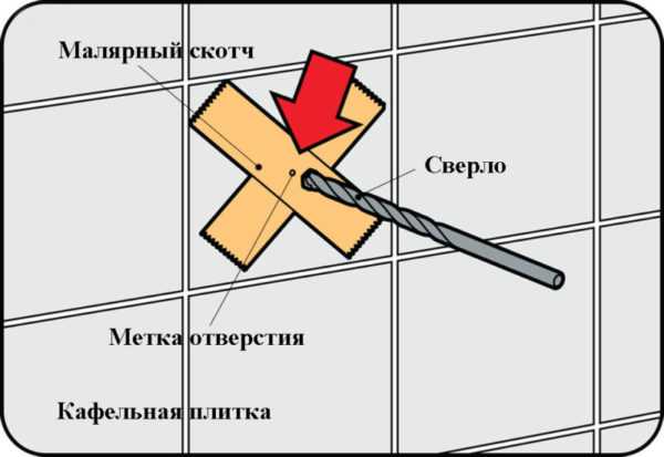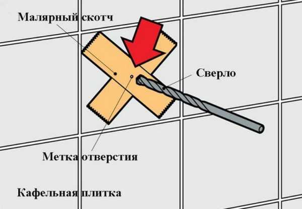 - Заклеиваем отмеченное место скотчем, таким образом, чтобы отметка была видна сквозь него. Скотч нужен для того, чтобы сверло «не гуляло» по поверхности кафеля. Многие мастера спорят, можно ли обойтись без скотча? Можно, но тогда кафельную плитку нужно накернить – нарушить целостность ее верхнего слоя, тихонько отбив эмаль в точке сверления.