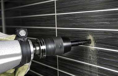 - Если надо просверлить отверстие между плитками (в шве), то это делать надо очень аккуратно. Поэтому сверло нужно устанавливать посередине шва. Если отверстие по разметке попало с краю кафеля, то осторожность надо увеличить в десять раз. Есть большая вероятность, что инструмент соскользнет с глазурованной поверхности в сторону шва, а это может стать причиной излома края кафеля. В конечном результате может лопнуть и сама плитка.