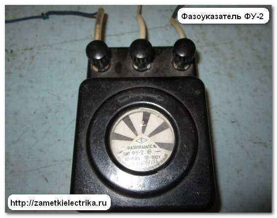 Проверить чередование фаз трехфазной сети можно фазоуказателем ФУ — 2. Он представляет собой небольшой корпус, на котором имеются три зажима для подключения трех фаз сети, алюминиевого диска с черной точкой на белом фоне и три обмотки. Принцип действия у него аналогичен работе асинхронного электродвигателя.