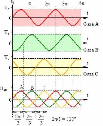 Трехфазный переменный ток графически представляет собой три фазы в виде чередующихся синусоид на оси Х, сдвинутых по отношению друг к другу на 120°. Первую синусоиду можно представить как фазу А, следующую синусоиду как фазу B, сдвинутую на 120° относительно фазы А, и третью фазу C, также сдвинутую на 120° по отношению к фазе В.