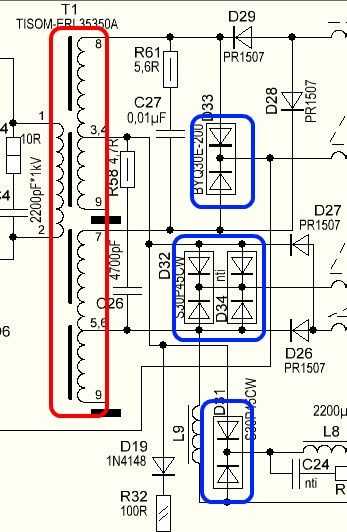 Обычно напряжение питания строчной развертки составляет 110…150 В в зависимости от размеров кинескопа. Просмотрев вторичные цепи, на плате рядом с импульсным трансформатором блока питания находим конденсатор фильтра, который чаще всего имеет емкость 47…100 мкФ и рабочее напряжение порядка 160 В. Рядом с фильтром находится выпрямитель напряжения питания строчной развертки.