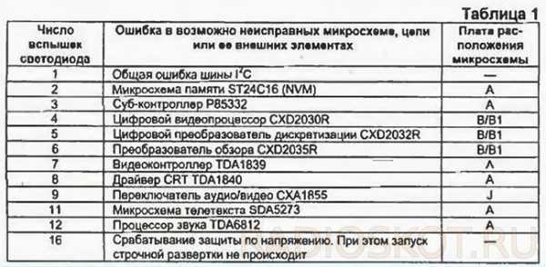 Коды ошибок ТВ по миганию LED После того, как признаки установлены, следует поискать принципиальную схему устройства, а лучше если выпущен Service manual на устройство, документацию со схемой и перечнем деталей, на специальных сайтах посвященных ремонту электроники. Также не лишним, будет в дальнейшем, вбить в поисковик полное название модели, с кратким описанием поломки, передающим в нескольких словах, ее смысл.