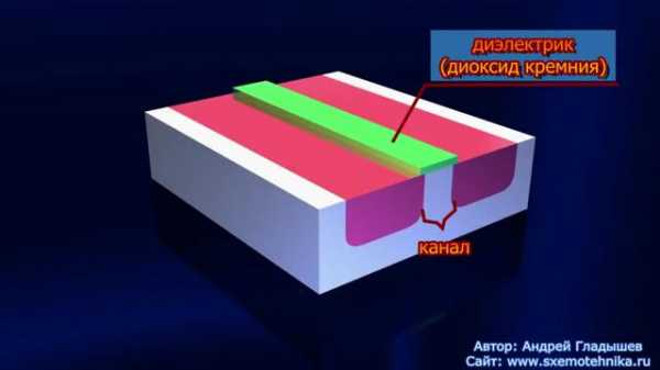 Пространство между двумя n-областями, называемое каналом покрывается диэлектриком, обычно это диоксид кремния.