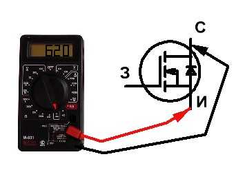 Включаем мультиметр в режим проверки диодов. Красный (плюсовой ) щуп мультиметра подключаем на затвор (имеет p-проводимость), а черный на исток. Мультиметр должен показать падение напряжения на открытом p-n переходе, которое должно быть в пределах 600-700 мВ.