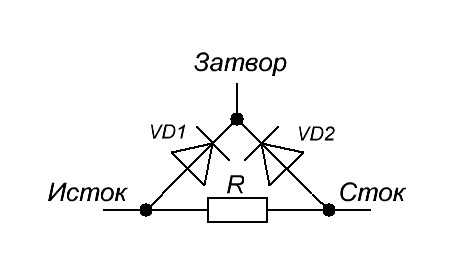 3. Теперь p-n переходы обозначим диодами, а электропроводность канала резистором.