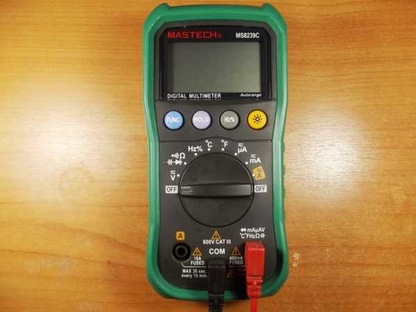 - Подключить черный провод мультиметра к минусу измерительного прибора, а красный – к плюсу.