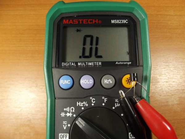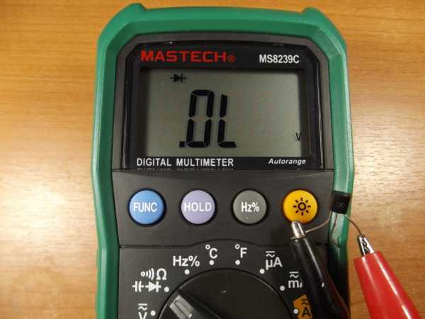 - Меняем полярность (красный и черный щуп) местами и повторяем измерения. Если электронный компонент исправный, отобразится сопротивление, стремящееся к минимальному значению. При показании «1» (измеряемая величина превышает возможности устройства), можно констатировать внутренний обрыв в цепи, следовательно, потребуется замена радиоэлемента.