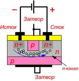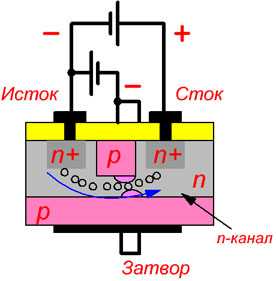 По достижению определенной концентрации электронов под затвором, между истоком и стоком создается тонкий n-канал, по которому потечет ток от истока к стоку.