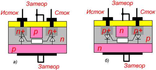 1. В транзисторе имеются два p-n перехода, первый между затвором и истоком, второй между затвором и стоком.