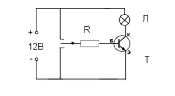 - R – резистор, его номинал рассчитываем по формуле h31Э*U/I, то есть, умножаем величину входящего напряжения на минимальное значение коэффициента усиления (для КТ827A – 750), полученный результат делим на ток нагрузки. Допустим, мы используем лампочку от габаритных огней автомобиля мощностью 5 Вт, ток нагрузки составит 0,42 А (5/12). Следовательно, нам понадобится резистор на 21 кОм (750*12/0,42).