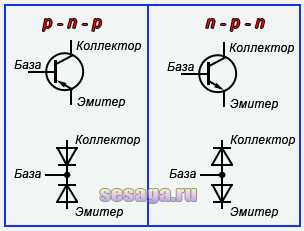 Мы знаем, что транзистор имеет два p-n перехода, причем каждый переход можно представить в виде диода (полупроводника). Поэтому можно утверждать, что транзистор — это два диода включенных встречно, а точка их соединения будет являться «базой».