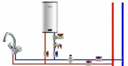 Входной патрубок бойлера подключается к трубе ХВС (через тройник), а выходной – к трубе, питающей «горячую» сторону смесителей.