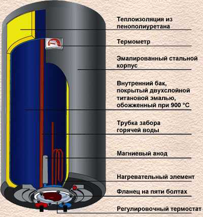 Основной элемент любого водонагревателя – бак. Принцип работы водонагревателя очень напоминает принцип работы обыкновенного термоса с подогревом. Именно по этой причине на сегодняшний день при изготовлении баков для водонагревательных приборов особое внимание уделяют именно внутреннему их покрытию.
