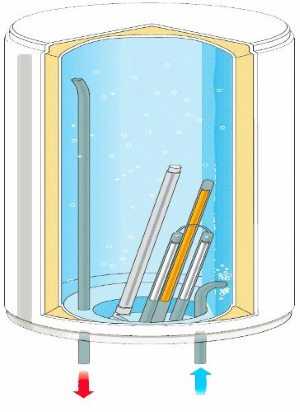 Внутри водонагревательного прибора располагаются специальные трубочки, отвечающие за подачу в него холодной и забор горячей воды. Вода в бак поступает снизу. Здесь она равномерно распределяется по всему объему бака, благодаря специально установленному рассекателю струи. Это способствует тому, что нагретая вода в баке теплыми массами постепенно вытесняется наверх, откуда и производится ее забор. В основном работа водонагревателя основывается на принципе не смешивания разных слоев жидкостей, благодаря чему в баке получается вода однородной температуры.