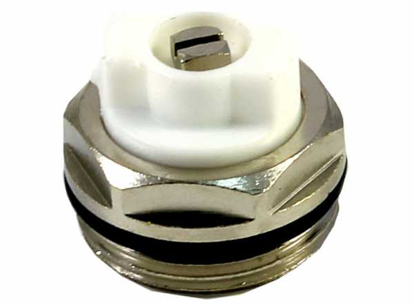 Фото 2: Как работает кран Маевского для радиаторовКран Маевского позволяет без особого труда спустить воздух из батареи или полотенцесушителя, но в тоже время делает слив горячей воды достаточно неудобным и трудоемким процессом. Он состоит из металлической пробки с наружной резьбой и маленьким отверстием по центру. Для открытия и закрытия крана, с противоположной стороны вкручивается запорный винт, головка которого спроектирована под специальный ключ для крана Маевского и обычную шлицевую отвертку. Поверх винта имеется пластиковый кожух с небольшим отверстием, задающим направление выхода воздуха.