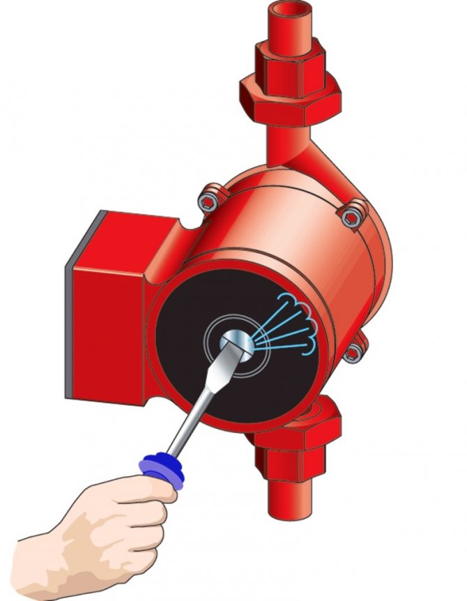 Если этот прибор установить в отопительную систему, то он будет вызывать движение теплоносителя за счёт захватывания жидкости с одной стороны и нагнетания её в трубопровод с другой стороны. Всё это происходит за счёт центробежной силы, которая образуется в процессе вращения колеса с лопастями. В ходе работы прибора давление в расширительном баке не изменяется. Если требуется повысить уровень теплоносителя в отопительной системе, устанавливают повышающий насос. Циркуляционный агрегат только способствует преодолению водой силы сопротивления.