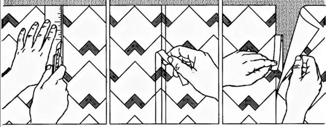 Обои можно нарезать на полу, например на клеенке. Но бывает, что нет места — все заставлено мебелью. В этом случае я режу их прямо на стене — прикладываю сверху и отрезаю у пола.