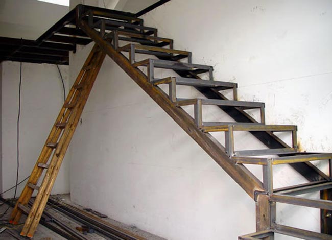Приставная металлическая лестница — вариант, который изготовить проще всего. Делается приставная лестница с использованием сварки. Для получения двухметровой конструкции понадобятся опоры — две трубы диаметром 5—6 см, а также 6—7 поперечин — трубок круглого сечения 2,5—3 см и длиной 0,7 м. Отмерив от верха каждой из опор по 25 см, приваривают верхнюю ступеньку. Откладывая дальше по 25 см определяют положение остальных ступенек, после приваривания которых получается приставная лестница. Делаем приставную лестницу из металла