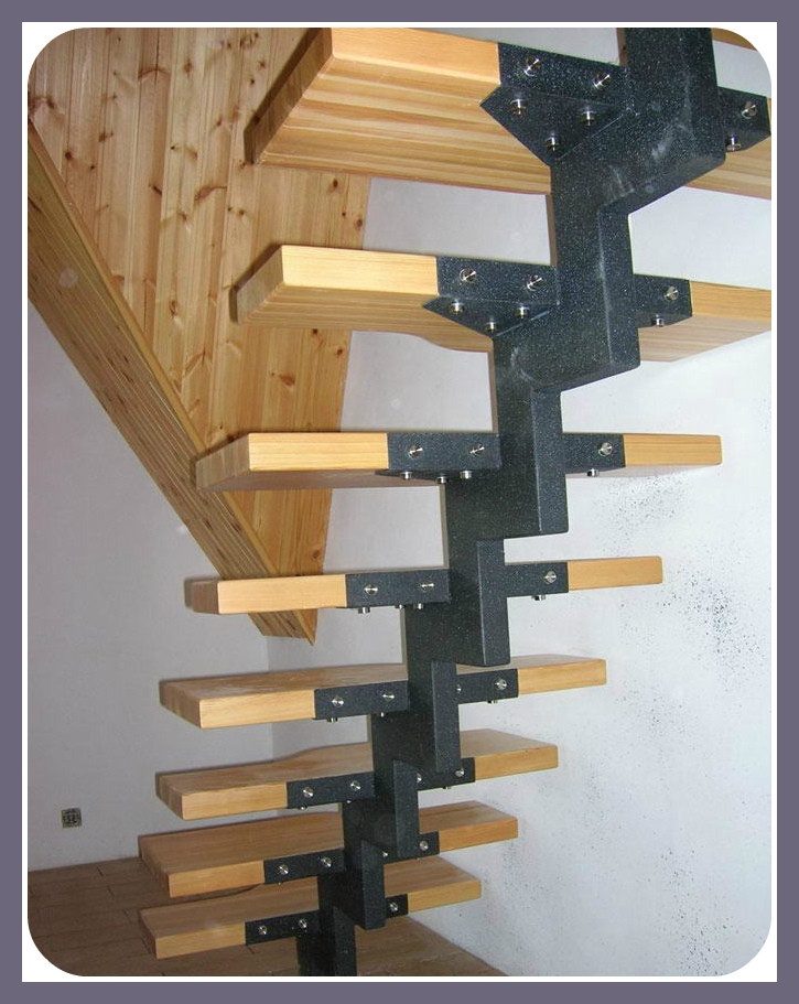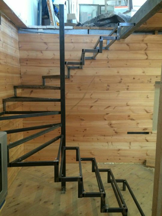 Из металла можно сделать либо каркас ступени, либо полностью всю ступень. Первый вариант предпочтительнее. Каркас сваривается из уголков. Форма ступеней — трапециевидная, почти треугольная. Средняя часть должна быть не уже 20 см. В качестве облицовки часто используется дерево. Ступени будущей лестницы следует сначала крепить к гильзам. Гильзы делаются из трубы, диаметр которой немного больше, чем диаметр центральной стойки. Высота гильз выбирается из диапазона 200—260 мм. После того как ступень приварена к гильзе, полученную конструкцию можно просто надеть на центральную стойку.