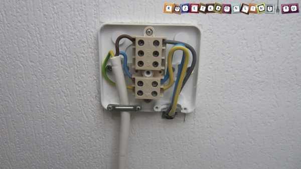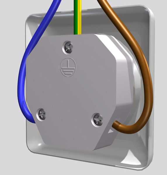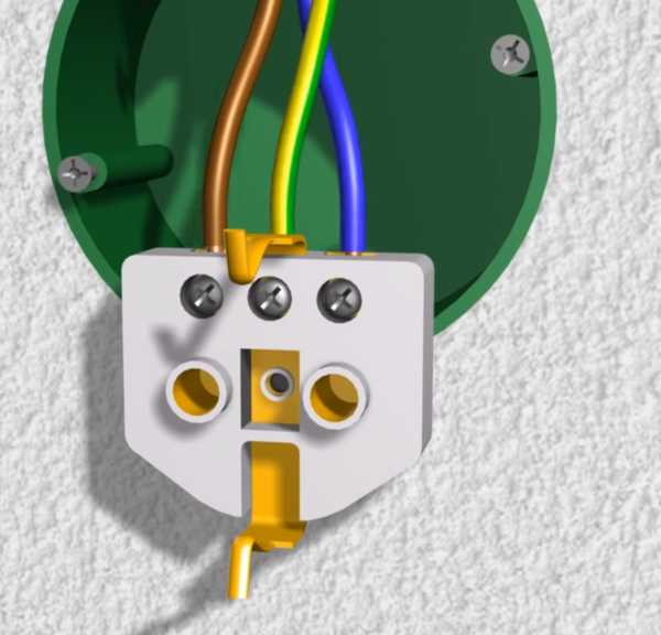 Шаг 3. Провода коричневого и синего цвета устанавливаются по бокам розетки, а многоцветная жила в центре. Центральный провод является заземлением. Обычно он имеет желто-зеленую изоляцию. Прочие провода могут иметь различные расцветки, но всегда однотонные. Важно соблюдать полярность в присоединении. Коричневая жила фиксируется на контакте L, а синяя на N.