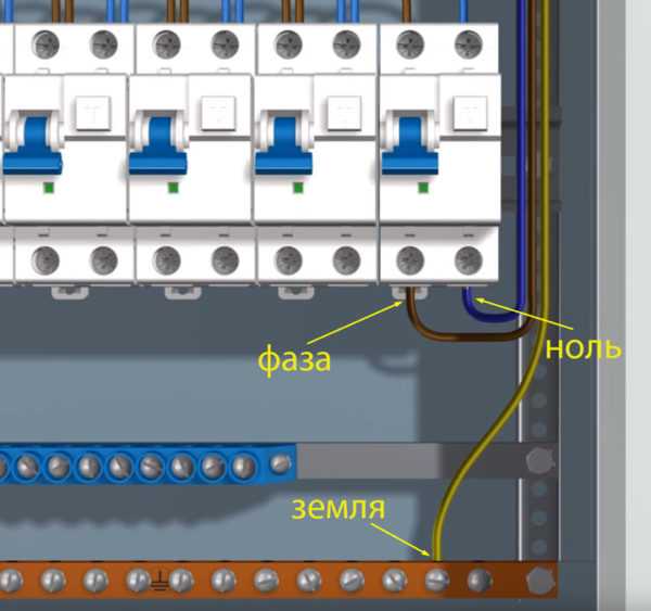 Темный провод подключается внизу автомата к контакту с маркировкой L. Жила с синей изоляцией вставляется внизу к гнезду с обозначением N. Зелено-желтый провод зажимается к свободной клемме шины заземления. После этого включатель автомата можно перевести в рабочее положение. Применяя токоискатель следует проверить наличие напряжения на розетке.