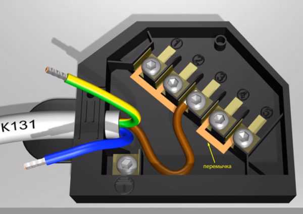 В 1-фазной сети жилы коричневого и синего цвета присоединяются к крайним болтовым зажимам. Проводок заземления фиксируется в центре вилки. Дополнительно сам кабель закрепляется специальной зажимной накладкой, что предотвратит его вырывание из вилки. Далее все собирается в обратном порядке.