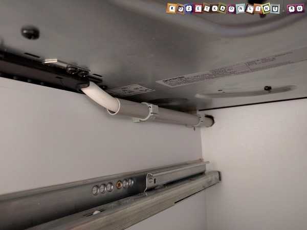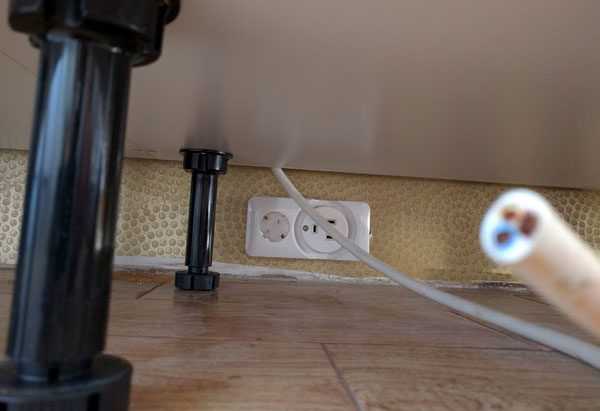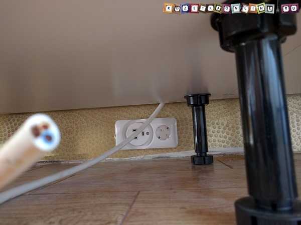 При желании скрыть коммуникации разрешается фиксировать розетку непосредственно внизу под дном нижних кухонных шкафов. При таком размещение доступ к ней осуществляется через пространство создаваемое высотой ножек тумбочек. Ее следует приподнять над полом на высоту хотя бы несколько сантиметров, чтобы в случае протечки вводы электрические контакты не намокли.