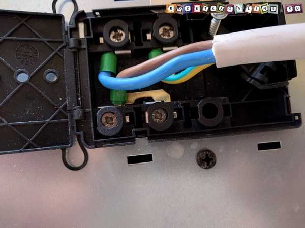 - После того, как была снята крышка с задней части, находим клеммы этого прибора. Вставляем кабельный зажим в отверстие, шнур удерживают при помощи пластины. Кабель запускают через кабельный зажим, винты не затягиваем.